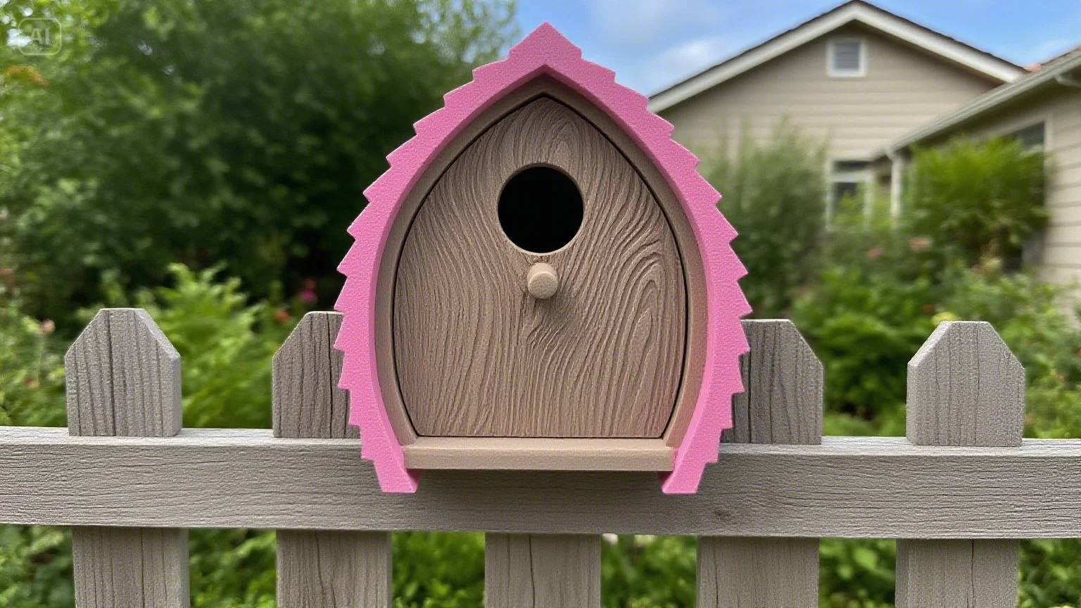 Wooden birdhouse with pink edging on a gray wooden fence, green foliage, and houses in the background.
