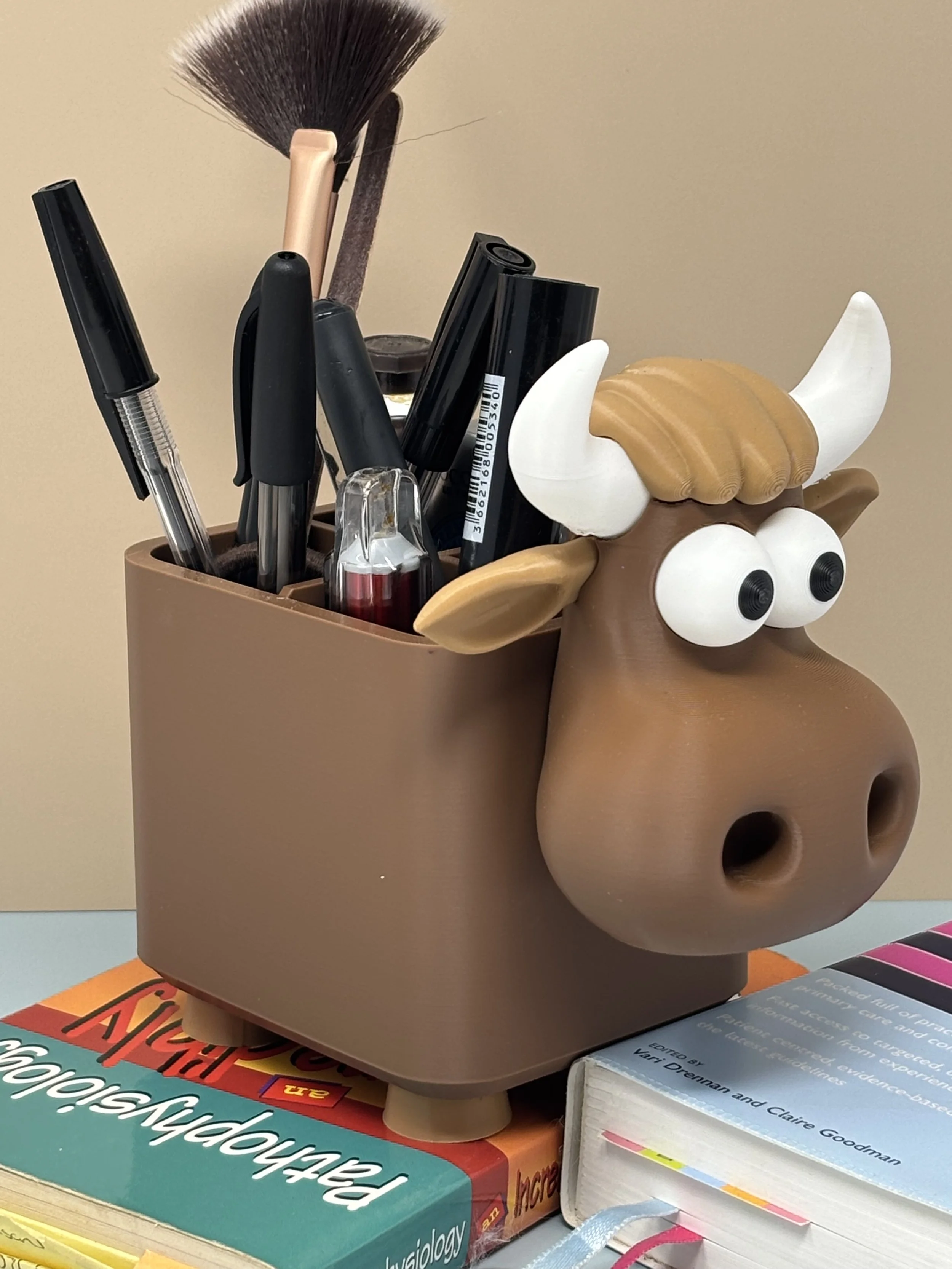 A desk organizer with a cow face design holds pens, markers, and office supplies, placed on top of books.